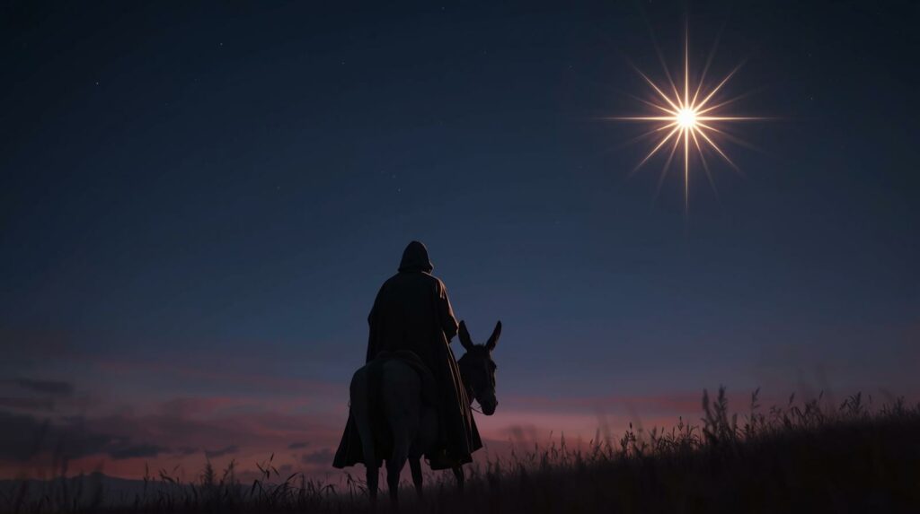 Au soir le mage se met en route. Son âne le porte, infatigable, en direction de l’étoile qui brillait à nouveau du côté du soleil couchant. Le mage voyage longtemps, il se repose surtout le jour et attend le soir avec impatience pour que l’étoile lui indique la bonne direction.